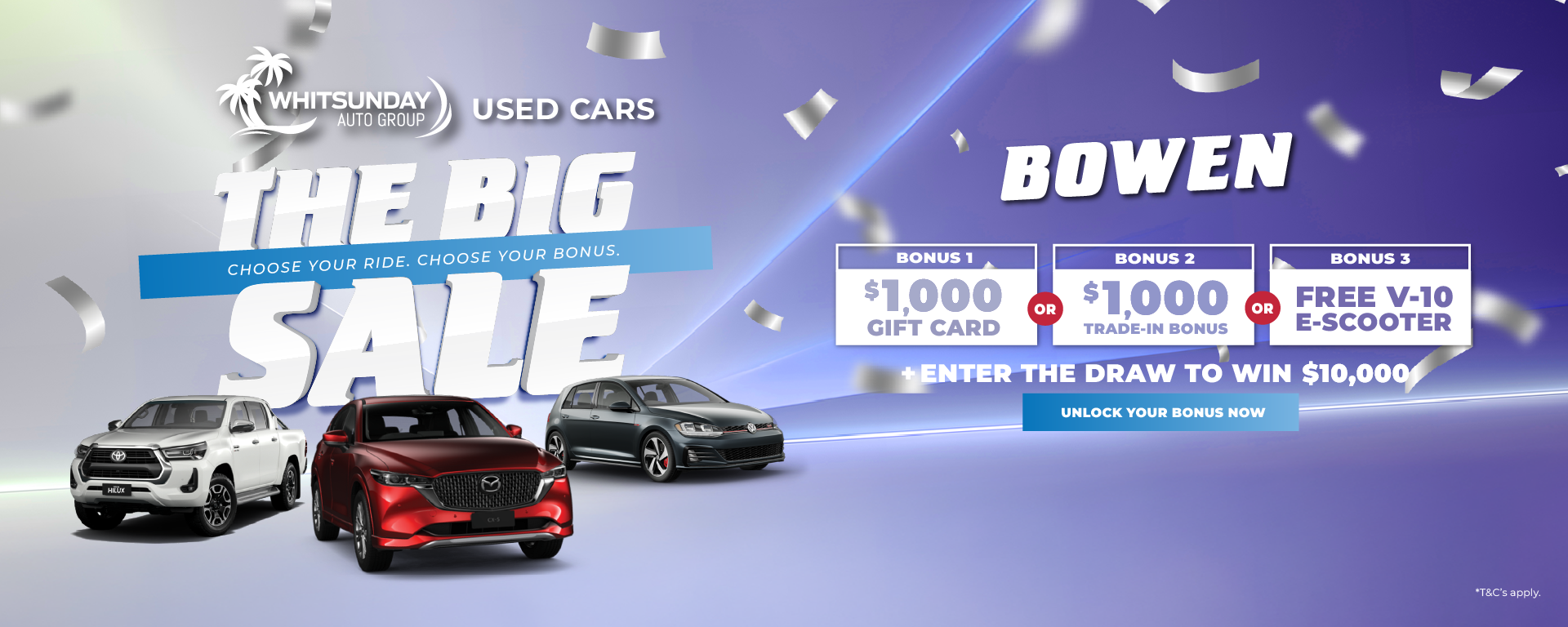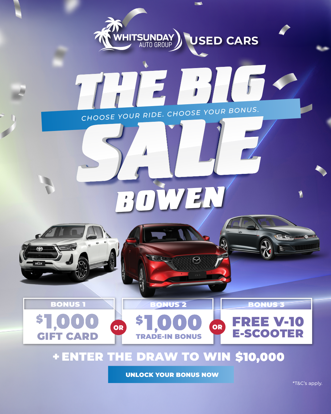 *Terms and Conditions apply. Bonus offer valid on select stock only. Bonus offer is a choice of either ‘$1000 Trade-In Bonus’, ‘$1000 Gift Card’ or ‘FREE V-10 E-Scooter’. ‘$1000 Trade-In Bonus’ will only be paid on qualified trade-in vehicles, that are still in good working order, are currently registered, and can be driven to dealership location at time of vehicle changeover. ‘$1000 Gift Card’ will be presented in the form of a Prezzee Smart eGift Card. ‘FREE Benzina V-10 E-Scooter’ is valued at $1,099 RRP delivered by Westpoint EV. Choice of Bonus Offer is applicable on in-stock vehicles only, purchased from Monday 9/06/2025 – Saturday 21/06/2025 unless extended or varied. $10,000 Prize will be presented in the form of a Gift Voucher. One (1) entry per vehicle purchased during Sale Event dates and paid in full by 30/06/2025. $10,000 Prize will be drawn Monday 21/07/2025. Winner will be notified by contact details supplied on vehicle contract, and if not claimed within 24 hours of draw, prize is forfeited, and prize will be redrawn. Excludes Fleet and Government buyers. Offer cannot be redeemed for cash, returned for a refund or transferred. Bonus offer will be provided during or after vehicle delivery, no later than 31/07/2025. Bonus Offer will be issued to the individual stated on the vehicle contract if nominated. Customer details on this waiver must match what is supplied on the vehicle contract. Whitsunday Auto Group reserves the right to amend these Terms and Conditions at any time.